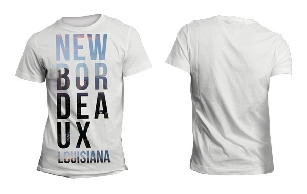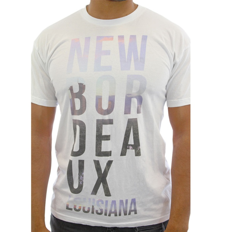 Tričko s nápisem NEW BORDEAX Louisiana se siluetou města v něm. Jedná se o oficiální produkt Mafia III, tričko je bílé barvy a velikosti M